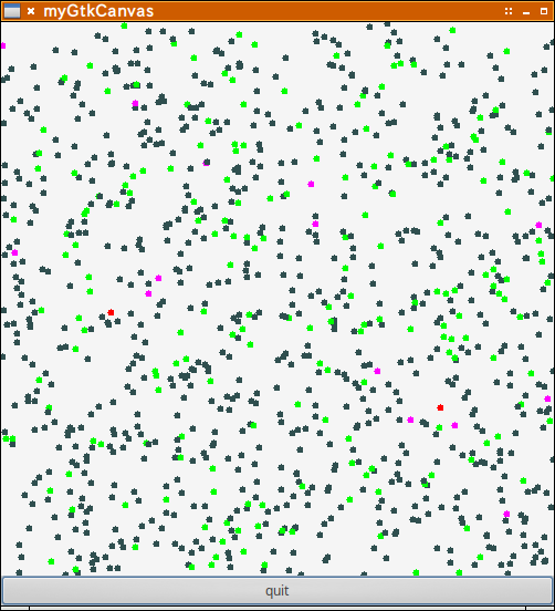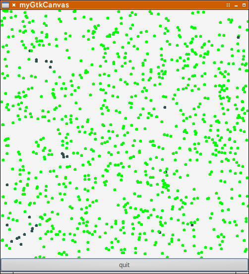 - 各エージェントは,毎サイクル,標準偏差 0.2 の正規分布に従うステップのランダムウォークで移動する.ただし,100サイクル(1日)ごとに,エージェントは各々の本拠地に戻される.本拠地の場所は最初に一様ランダムに決められる.